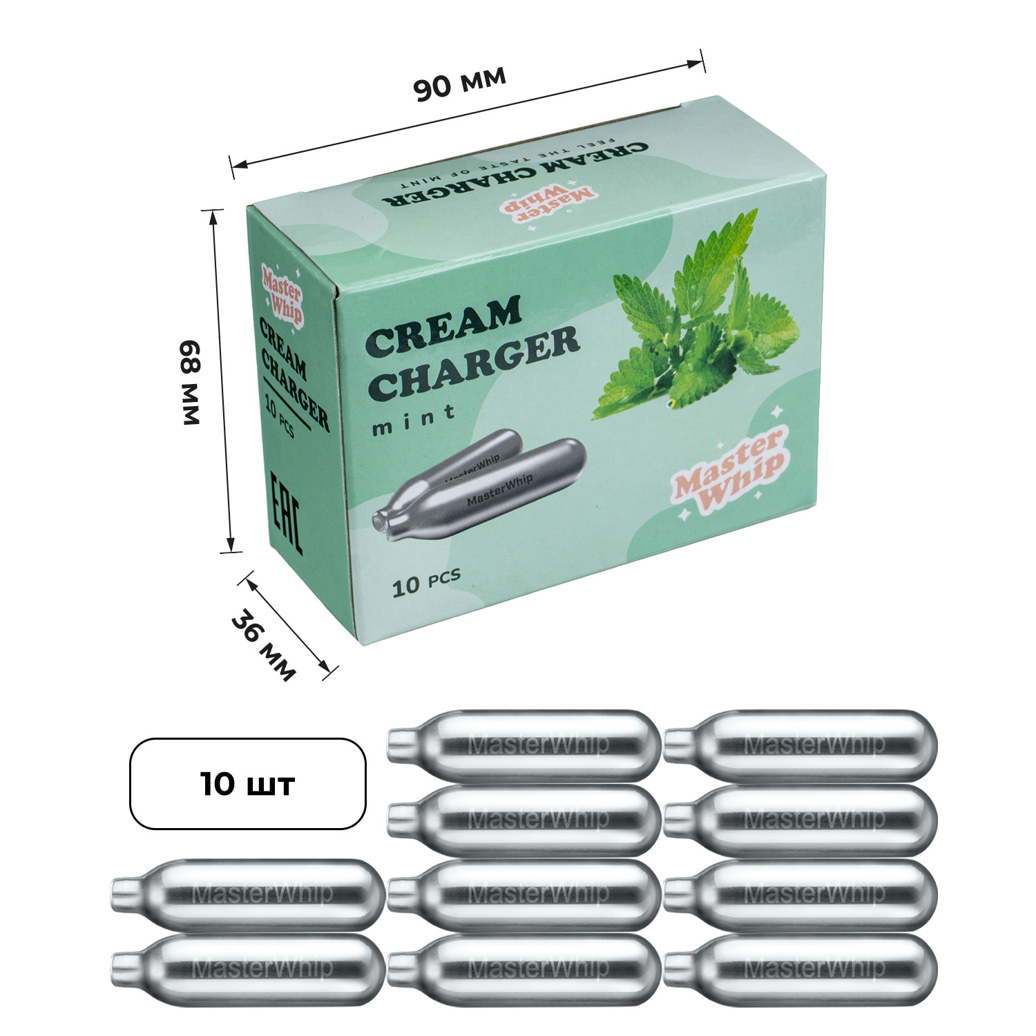 Баллончики для сифона для взбивания сливок (N2O) 10 шт/уп. вкус мята MasterWhip /1/36/