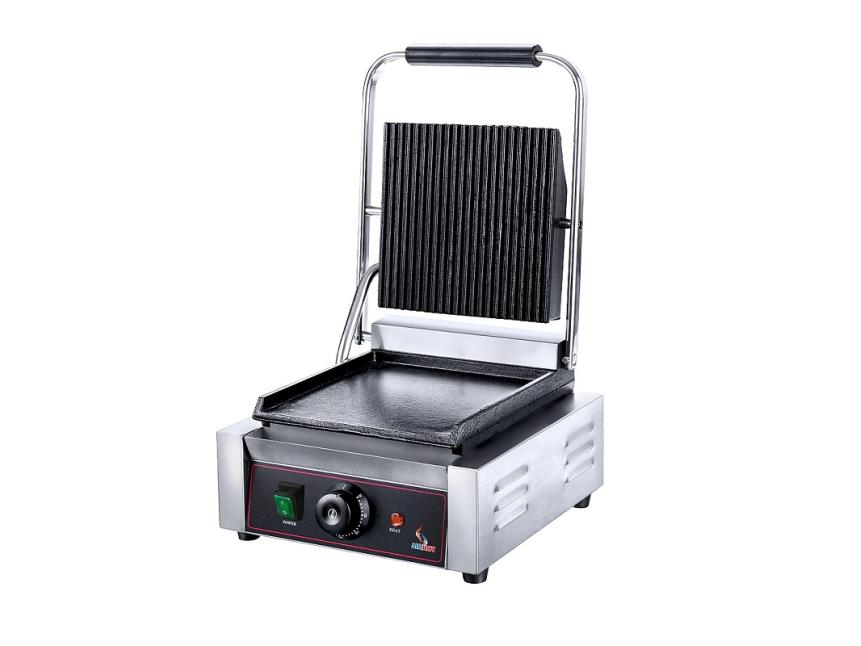 Гриль предназначен для жарки мяса, птицы, рыбы, овощей, а также для приготовления стейков, гамбургеров и горячих сэндвичей на предприятиях общественного питания и торговли. Высокая скорость приготовления достигается благодаря встроенным в обе части аппарата тепловым элементам, которые плотно прилегают к продукту. Модель оснащена терморегулятором и съёмным поддоном для сбора жира и крошек. Корпус выполнен из нержавеющей стали, жарочная поверхность - из чугуна с антипригарным покрытием.