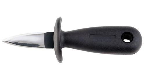 Рукоять ножа с защитой пальцев выполнена из ударопрочного пластика с нескользящей поверхностью и широкой задней частью, что позволяет крепко и безопасно держать нож при открывании моллюска.