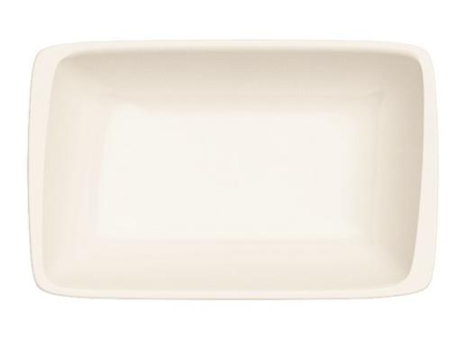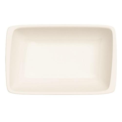 Блюдо прямоугольное белого цвета со сливочным оттенком.