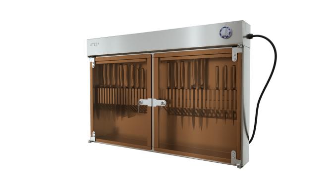 Стерилизатор предназначен для крепления к стене. Две двери стерилизационной камеры изготовлены из тонированного стекла, которое обеспечивает защиту персонала от воздействия ультрафиолетовых лучей.