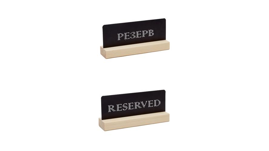 Табличка Резерв стола черная двусторонняя размером 150х70х40 мм. Верхние углы у таблички скруглены. Устойчивое основание из натурального бессучкового дерева высшей степени обработки. Табличка для заведений общепита, кафе и ресторанах.
