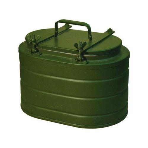Термос походный состоит из крашеного металлического контейнера корпуса, вынимающейся нержавеющей колбы и крышки притягиваемой болтами с барашками.