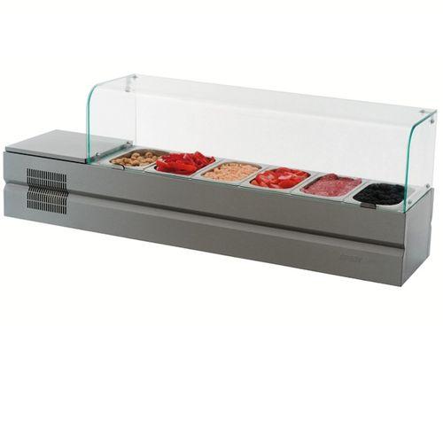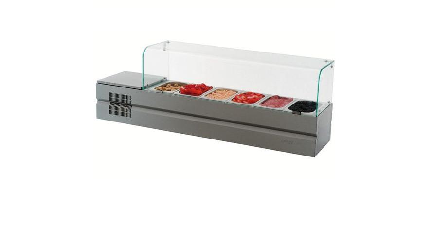 Холодильная витрина ATESY Болоньезе-6 используется на предприятиях общественного питания и торговли для кратковременного хранения и демонстрации компонентов пиццы (топпингов). Модель оснащена встроенным холодильным агрегатом, верхняя крышка которого выполнена в виде горизонтальной площадки для размещения вспомогательных предметов. Корпус выполнен из нержавеющей стали и моллированного стекла, все конструктивные элементы, контактирующие с продуктами питания - из нержавеющей стали, разрешенной Госсанэпиднадзором для контакта с пищей.